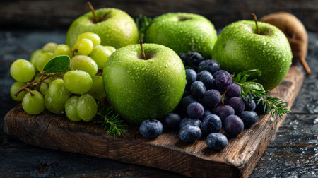 A stunning arrangement of fresh green apples, juicy grapes, and rich blueberries on a rustic wooden board, showcasing water droplets and vibrant colors.
