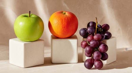A visually appealing arrangement of a green apple, vibrant orange, and fresh grapes on stylish cubes, beautifully lit to showcase colors and textures ideal for health themes.