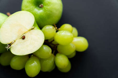 top view of apple half on top on grapes on black