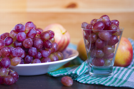 Sprigs of grapes in a plate and in a glass with apples