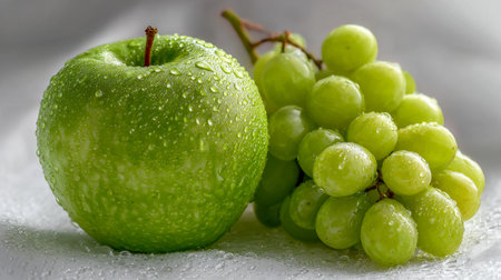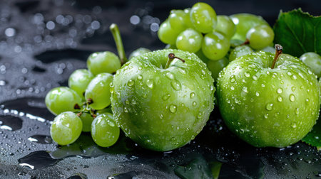 A stunning arrangement of fresh green apples and juicy grapes adorned with water drops highlights the allure of nature's bounty. Perfect for showcasing healthy eating themes.