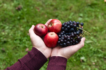 Hands holding fresh red apples and dark purple grapes against a green grass background.