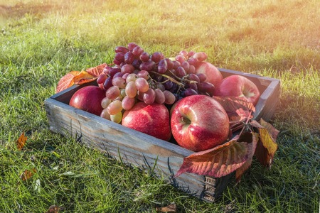 Beautiful ripe bunch of grapes and red apples on the grass in a wooden box. The concept of harvest.