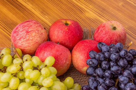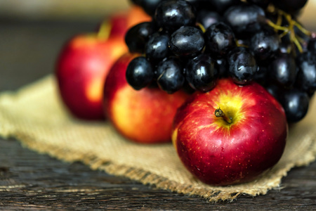 Fresh ripe red apples and grapes on burlap napkin