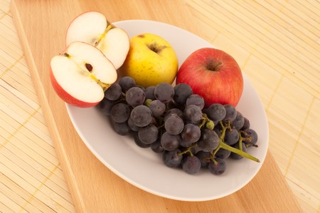 Plate with apple and grape on a wooden table for vegetarian breakfast