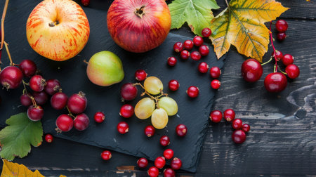 A vibrant display of freshly harvested fruits including apples, pears, and grapes, accented by colorful autumn leaves on a textured slate board.