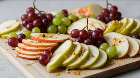 Sliced red apples and green pears are arranged with red and green grapes on a light wooden board. Honey is drizzled over the fruit, and chopped nuts are sprinkled on top.