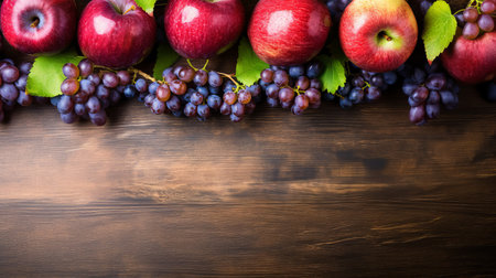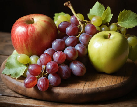 An AI generated illustration of red grapes and red apples on a wooden background