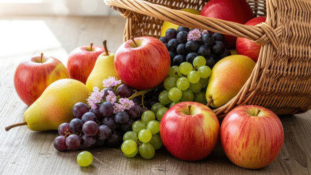 A rustic basket overflows with vibrant fruits, including red apples, green and purple grapes, and yellow pears. The composition features overhead lighting, highlighting the colors and textures of the produce. This image evokes feelings of freshness and abundance, suitable for use in healthy eating or food-related projects.