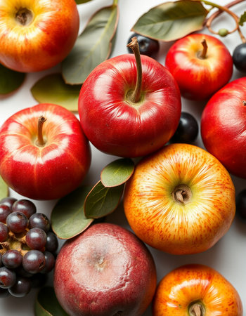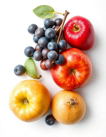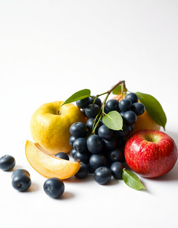 Fruits on a white background. Ripe apples and blueberries.