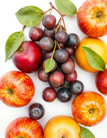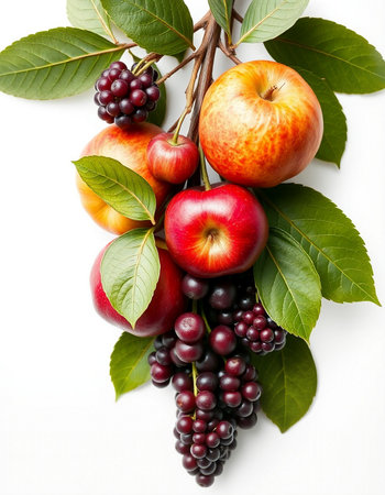 Autumn still life with apples, grapes and blackberries on white background