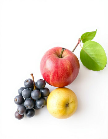 Red apple, black grapes and apple isolated on a white background.