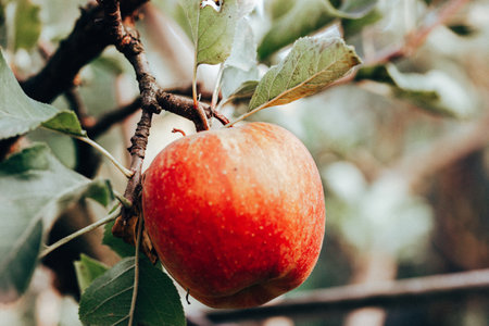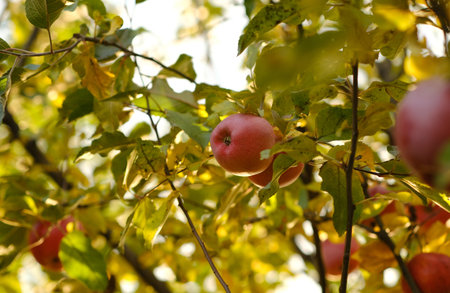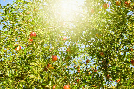 Red apple hanging from a tree in an orchard on sunny weather. Fruit picking season