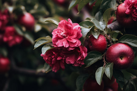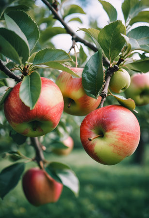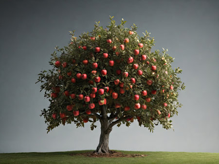 An AI generated illustration of An apple tree laden with ripe fruit adorns its branches