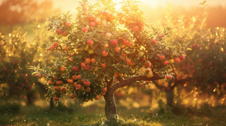 A beautiful apple tree standing tall in an orchard, its branches heavy with apples, illuminated by the golden morning sun