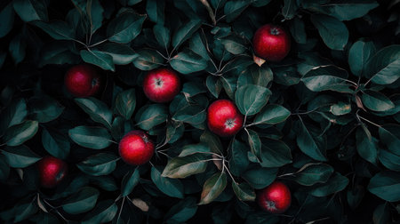 This stunning overhead shot showcases fresh red apples nestled among lush green leaves, creating a vibrant and inviting natural scene ideal for food and health themes.