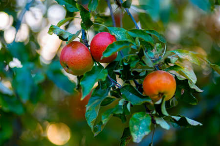 Apples on a green tree in the evening. Beautiful dark background with yellow bokeh. Red fruits in autumn. Toned image.