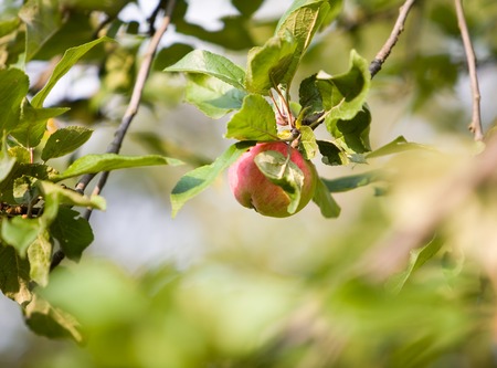 Red garden Apple on a branch. Harvest. Apple saved. Non-GMO fruit. A red Apple hangs on a branch. Copy space
