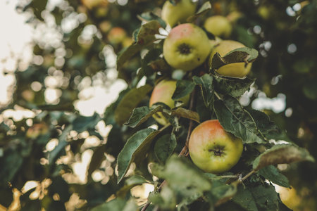 Fresh green apples hanging on tree branch with sunlight, orchard during harvest season. Natural agriculture and organic food concept