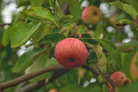 Two ripe red apples hanging from the branch of an apple tree in an orchard, on an organic fruit farm. Rural garden harvesting in summer.