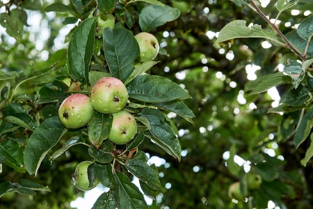 large ripe apples clusters hanging heap on a tree branch in an intense apple orchard. Dewdrops. Vitamins. Vegetarian