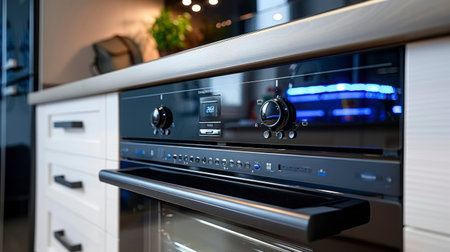 A close-up shot of a modern kitchen appliance control panel, showcasing its sleek digital display and buttons for temperature and timer settings, perfect for contemporary cooking environments.