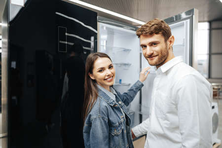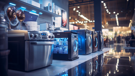 Panoramic blurry background refrigerators on display at hardware store in USA