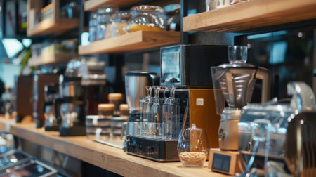 In a softly illuminated kitchen, shelves filled with various culinary tools and modern appliances create an inviting atmosphere. The warm lighting enhances the charm of this culinary haven.