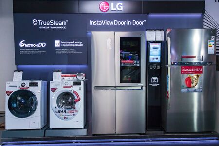 Kiev, Ukraine June 12, 2018: LG Company presents new home appliances TVs, refrigerators, washing machines, microwaves, telephones and music systems
