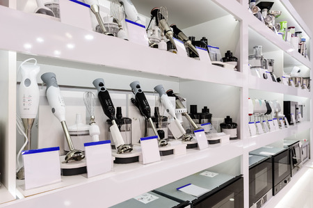Household appliances for the kitchen. Sale of electrical equipment for cooking at home. Coffee makers, mixers, meat grinders, blenders, coffee machines, toasters and kettles on a shelf in the interior.
