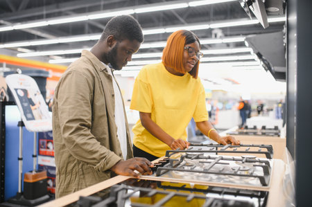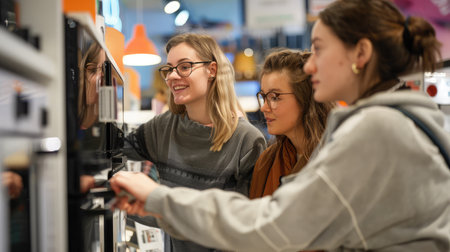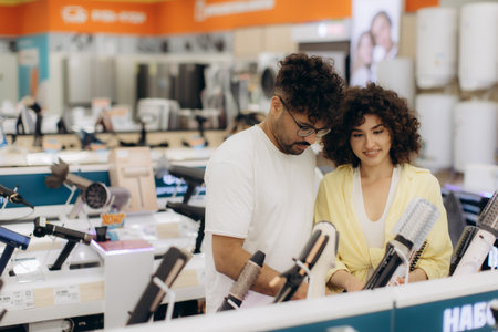A couple explores hair styling devices in a modern electronics store, showcasing interest and communication.