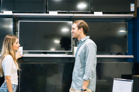 Smiling young man and woman are looking at the features of a television in a home appliance store. Cyber Monday concept.