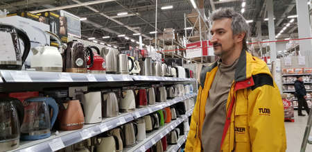 Russia, St. Petersburg 16,12,2018 The buyer chooses a kettle in the store