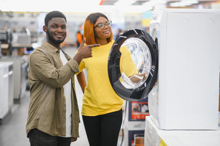 Two joyful men are shopping for new laundry appliances in a store, sharing a laugh while exploring options.