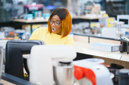 Young woman choosing kitchen mixer blender in home appliance shopping mall supermarket.