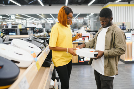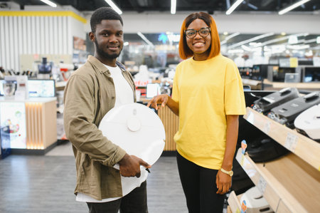 Happy couple holding a robotic vacuum cleaner, choosing home appliances in an electronics store