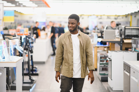 African american man browsing through various air conditioners in an appliance store, carefully selecting the perfect model for his home