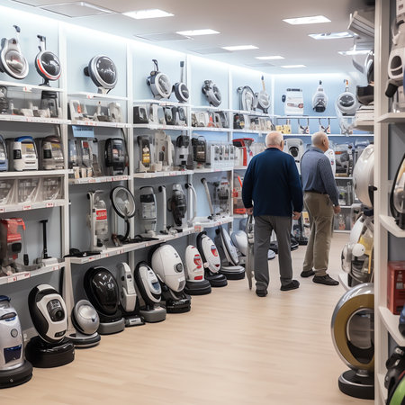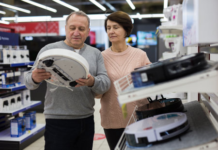Senior couple choosing robotic vacuum cleaner in appliance store