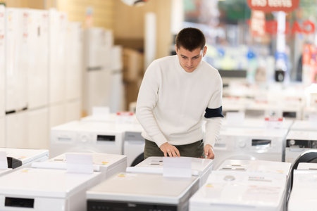 Minsk, Belarus - Nov 27, 2021: Photo of an adult handsome thinking brunet man with stubble in a white sweatshirt chooses headphones in an electronic store in a shopping mall. Shop and music concept