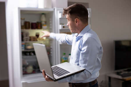 Coronavirus pandemic. Remote work in the home office. Quarantine. A man in a medical mask on his face and with a laptop in his hands stands in front of an open refrigerator.