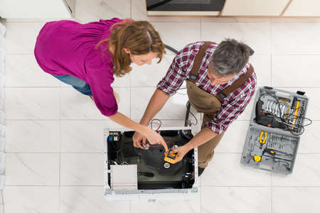 High Angle View Of Woman Looking At Technician Checking Washing Machine With Digital Multimeter