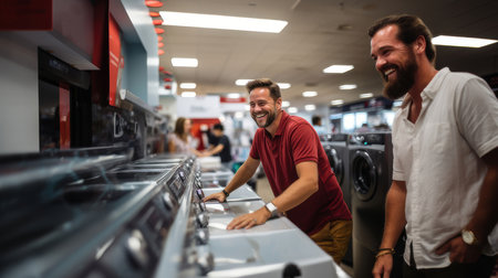 Two joyful men are shopping for new laundry appliances in a store, sharing a laugh while exploring options.