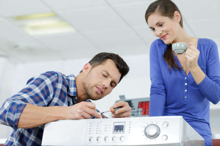 man repairing washing machine while customer is looking