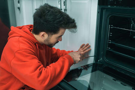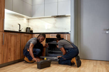 Experience and knowledge exchange concept. Expert and apprentice fixing kitchen oven