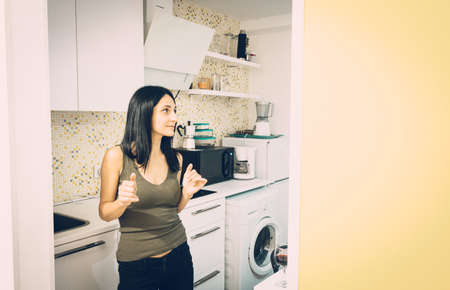 Young attractive woman dances in small kitchen suroudned by kitchenare. Positive attitude and happyness concept.