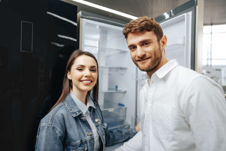 Young man and woman are buying a fridge in an appliance store. Cyber Monday concept.