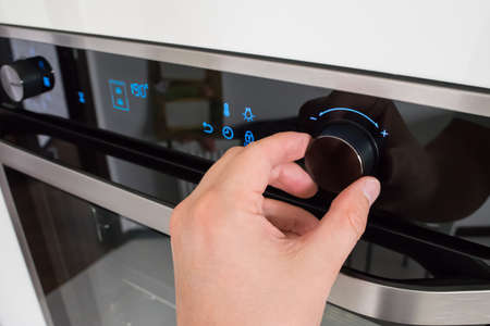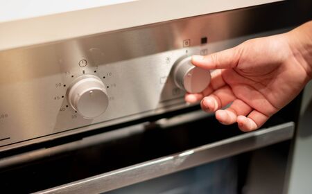 View of a male hand changing the oven temperature
