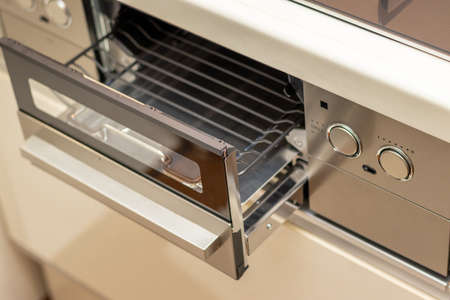 Close up of built in appliance. Element of electric oven with timer and buttons on control panel in modern kitchen room