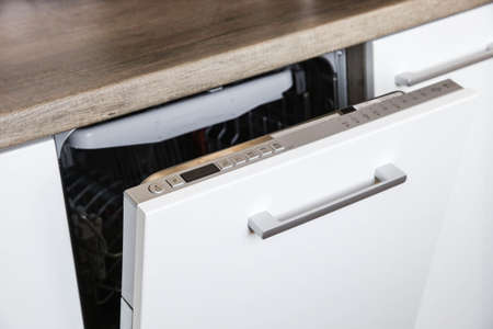 Close up of digital control panel of built-in dishwasher with timer and eco mode program