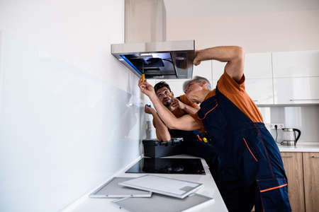Almost for any task. Two workers, handyman in uniform installing or repairing a kitchen extractor, replacing filter in cooker hood. Construction, maintenance and repair concept